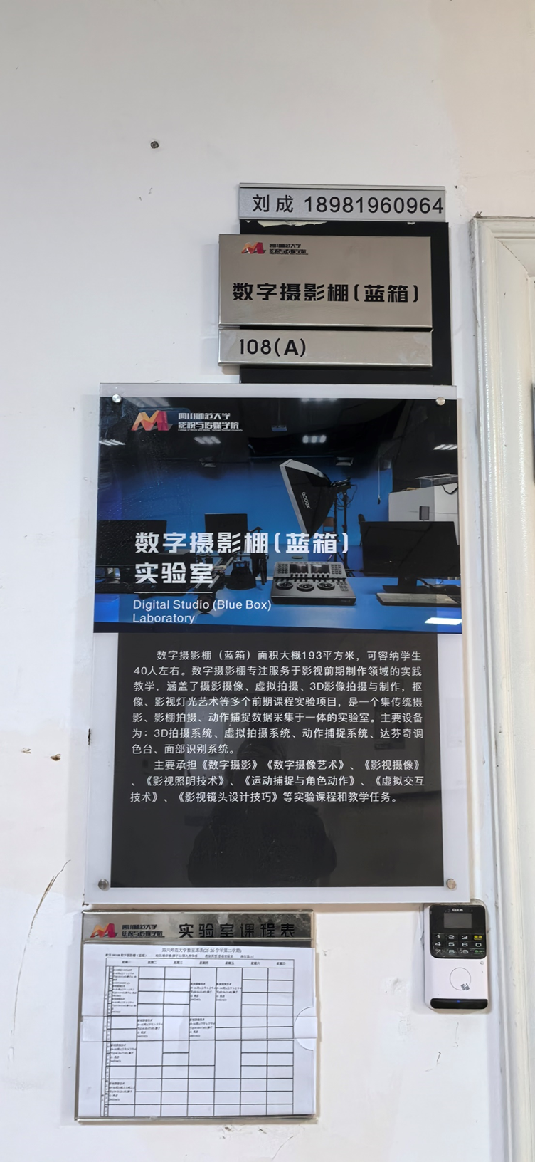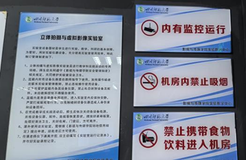 在硬件建设方面,学院在各场地醒目位置张贴安全警示牌,内容涵盖用电安全、防火防盗、设备操作规范、应急疏散指引等,实验室额外张贴危险源提示、防护措施等信息,确保标识清晰、规范统一。同时,对所有场地的消防设施、用电线路进行全面排查检修,更换老化器材,规范线路布局;在实验室、演播厅等重点区域配备应急物资,明确存放位置与使用方法,张贴设备操作规程。