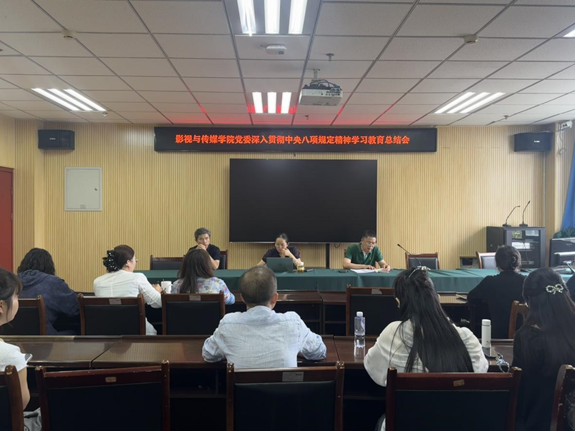 9 月 18 日,影视与传媒学院党委在综合实验楼 606 会议室召开深入贯彻中央八项规定精神学习教育总结会,传达学习习近平总书记关于深入贯彻中央八项规定精神学习教育的重要指示和中央党的建设工作领导小组会议、省委常委会会议、学校深入贯彻中央八项规定精神学习教育总结会精神,总结学院学习教育成效,研究部署巩固拓展学习教育成果、推动作风建设常态化长效化工作。学院党政班子成员、党委委员、纪委委员、科级干部、党支部书记、系主任、实验室负责人、专职组织员、网络管理员、全体辅导员参加会议,学院党委书记李绍军主持会议。