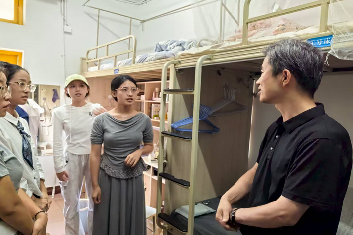 2025年9月9日16点,影视与传媒学院党政领导班子成员和各专业系主任、辅导员一行,前往2025级本科新生寝室走访慰问,详细了解了同学们的入学报到、入住寝室等情况,并与新生亲切交流,耐心解答大家关心的各类问题,传递学院关怀。