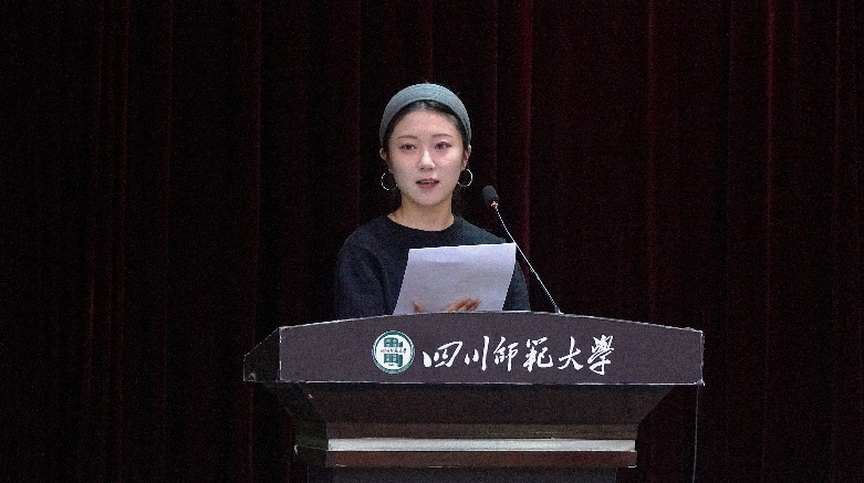 优秀校友代表杨正熙分享了自己在川师大的成长历程。杨正熙是四川师范大学戏剧影视导演专业2015级学生,毕业后在某高校工作,现为四川大学在读博士研究生。她说,从专业懵懂新生到明确创作方向,离不开学院恩师的指导,同时,母校的专业训练不仅教会她技能,更培养了“用多元视角思考问题、用人文情怀对待创作”的思维方式。她鼓励学弟学妹们珍惜在川师大的学习时光,在探索中坚定文化认同,在实践中传承母校“重德、博学、务实、尚美”的校训精神。