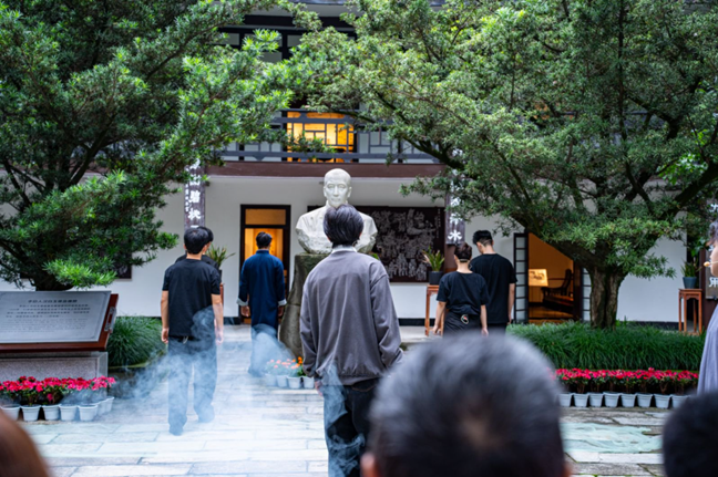 启动仪式结束后,“菱窠戏韵·市井欢歌”主题环境戏剧惠民展演活动正式拉开帷幕。此次环境戏剧打破了传统舞台的框架,融合评书演绎、时空对话等多种艺术表现形式,让主角不再只是台上的演员,更是走进来的每一位观众。展演过程中,观众跟随演员“穿越”回了李劼人先生人生中三个重要的时间点,了解了他为人民为国家所做出的贡献,也对“独立、进取、厚爱”的菱窠精神有了更深的感悟。