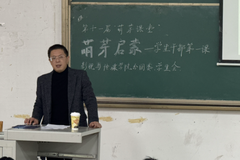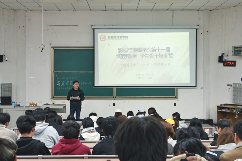 2025年11月12日中午,四川师范大学影视与传媒学院在狮子山校区第七教学楼114教室,开启学院第十一届萌芽课堂学生骨干培训第一课。影视与传媒学院党委书记李绍军主讲,学院分团委负责人袁林主持。学院分团委、学生会学生骨干和2025级主要班委参加培训。
