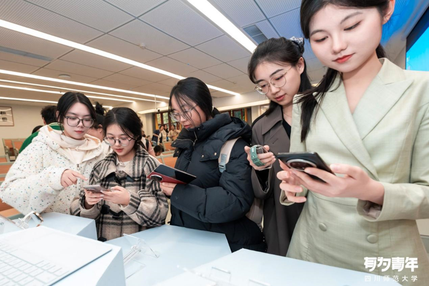 活动开场前,现场设置的HarmonyOS互联体验区便吸引了众多同学驻足。同学们围聚在体验设备旁,亲手操作手机、平板、手表等产品的多设备协同功能,直观感受鸿蒙生态的智慧互联魅力;而精心陈列的华为终端产品,则让大家近距离接触到前沿科技成果,为活动预热了浓厚的创新氛围。