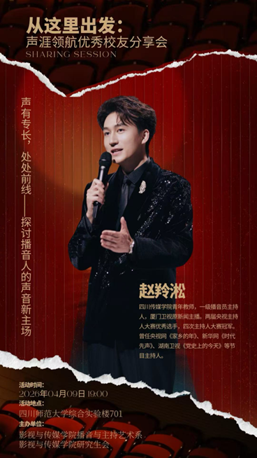 2026年正值四川师范大学建校80周年,“从这里出发:声涯领航优秀校友分享会”是我院庆祝建校80周年系列活动之一,旨在加强校友与母校之间的情感链接。未来,影视与传媒学院将搭建更多优质交流平台,邀请更多优秀校友返校传经送宝,充分发挥校友资源的育人效能,为学院与专业高质量发展注入持久动力。