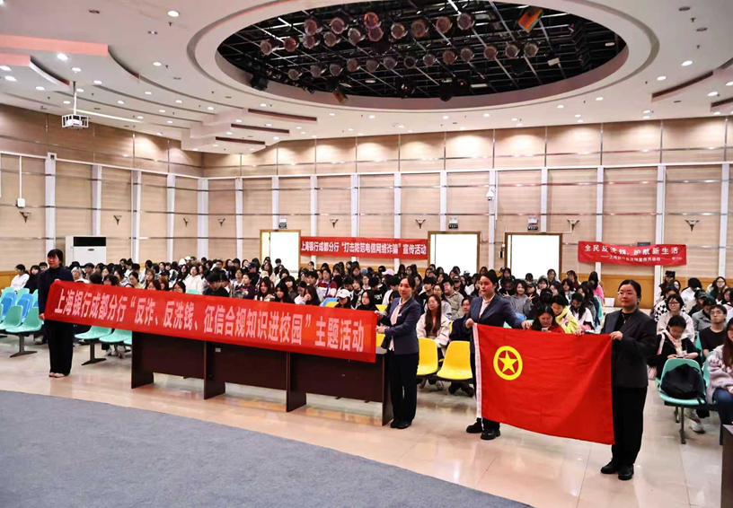 为切实提升2025级新生的诈骗防范意识,全面增强新生自我保护与风险规避能力。2025年10月28日12:30,影视与传媒学院特邀上海银行成都分行在狮子山校区桃李园三楼开展了一场“反诈、反洗钱、征信合规知识进校园”专题讲座。讲座特别邀请到上海银行成都分行公司部代表严冰玉、风险管理反洗钱专员魏靖雯、运营反诈专员石慧、营业部客户服务专员冯路,莅临现场讲解反诈反洗钱知识,学院400多名2025级新生参加了此次讲座。